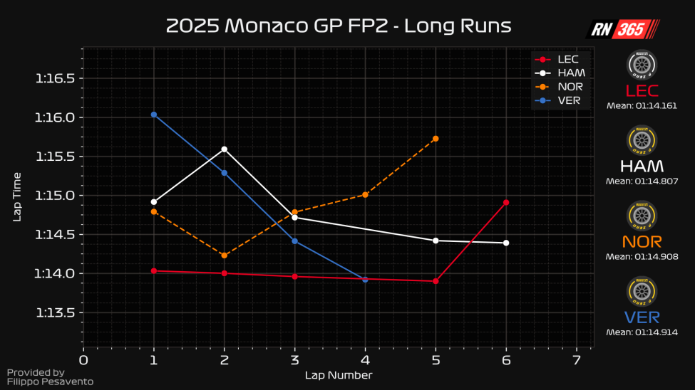 His average pace was 1:14.161s and was largely consistent through the run, although it was the more durable tyre.
