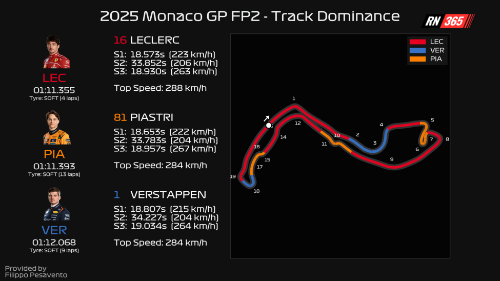 Here, he was 0.080s faster than second-placed Oscar Piastri, and two-and-a-half faster than Max Verstappen, who was actually quickest through Massanet, but Leclerc's extraordinary speed through Sainte Devote is key.